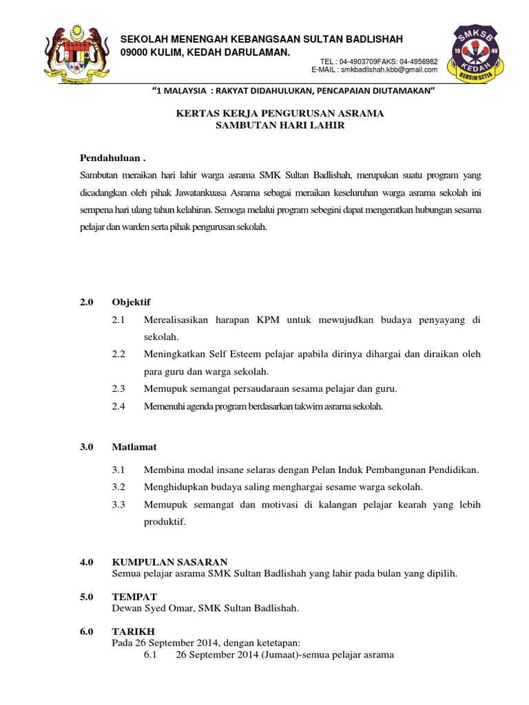 Kertas kerja majlis sambutan hari lahir peringkat sekolah siri 1 13 mac 2020 jumaat siri 2 19 jun 2020 jumaat siri 3 25 september 2020 jumaat siri 4 13 november 2020 jumaat anjuran. TUJUAN KERTAS KERJA 3 PROFAIL PERNIAGAAN 4. Semoga melalui program sebegini dapat.